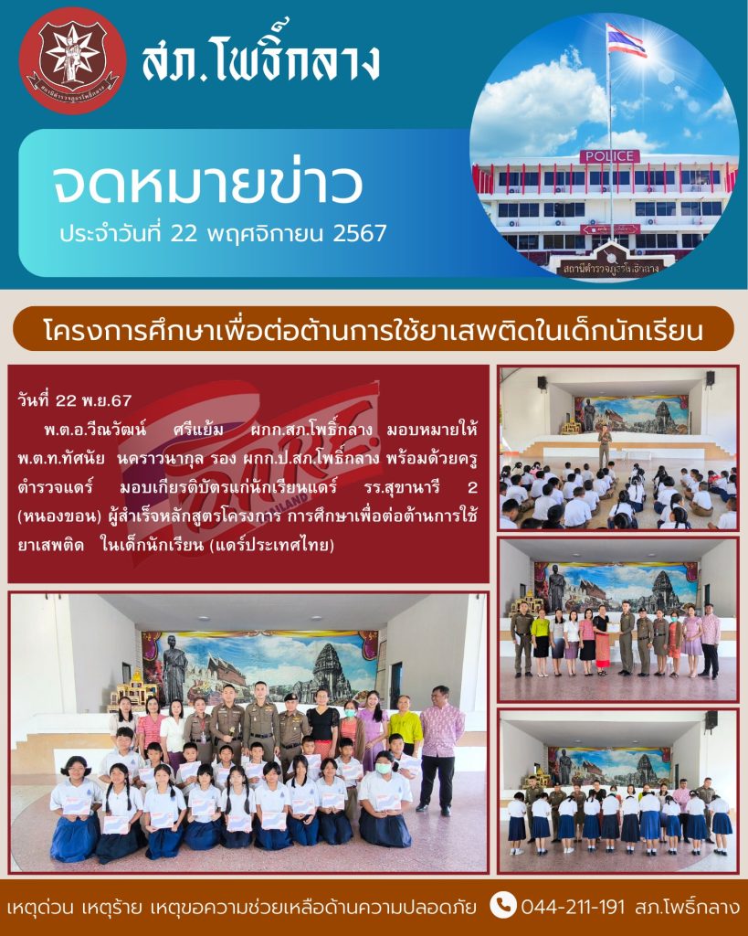 พ.ต.อ.วีณวัฒน์ ศรีแย้ม ผกก.สภ.โพธิ์กลาง มอบหมายให้ พ.ต.ท.ทัศนัย นคราวนากุล รอง ผกก.ป.สภ.โพธิ์กลาง พร้อมด้วยครูตำรวจแดร์ มอบเกียรติบัตรแก่นักเรียนแดร์ รร.สุขานารี 2 (หนองขอน) ผู้สำเร็จหลักสูตรโครงการ การศึกษาเพื่อต่อต้านการใช้ยาเสพติดในเด็กนักเรียน (แดร์ประเทศไทย)