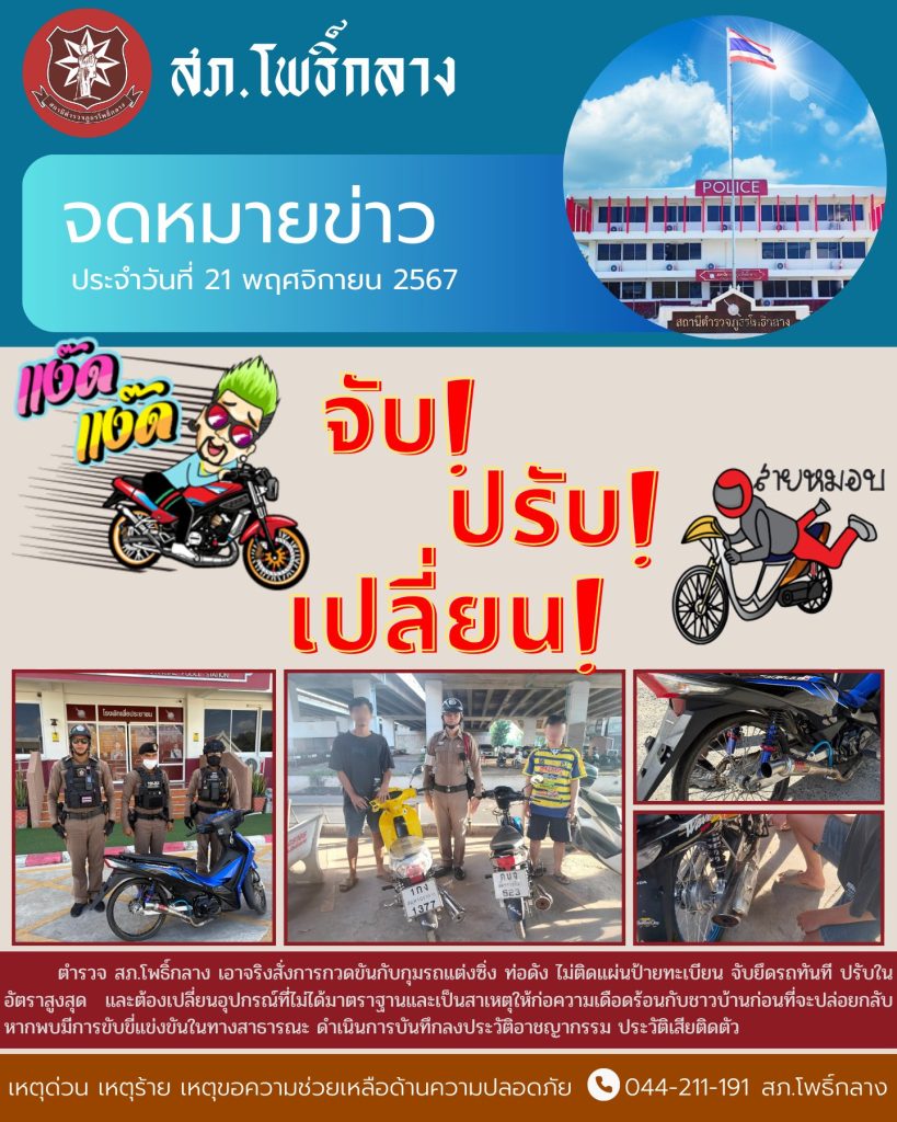 ตำรวจ สภ.โพธิ์กลาง เอาจริงสั่งการกวดขันกับกุมรถแต่งซิ่ง ท่อดัง ไม่ติดแผ่นป้ายทะเบียน จับยึดรถทันที ปรับในอัตราสูงสุด และต้องเปลี่ยนอุปกรณ์ที่ไม่ได้มาตราฐานและเป็นสาเหตุให้ก่อความเดือดร้อนกับชาวบ้านก่อนที่จะปล่อยกลับ หากพบมีการขับขี่แข่งขันในทางสาธารณะ ดำเนินการบันทึกลงประวัติอาชญากรรม ประวัติเสียติดตัว พบการกระทำผิด โทร 044211191 สภ.โพธิ์กลาง