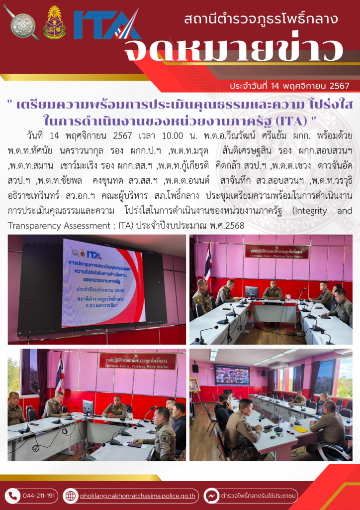 วันที่ 26 พ.ย.67 เวลา 09.00 – 16.00 น. พ.ต.อ.วีณวัฒน์ ศรีแย้ม ผกก.สภโพธิ์กลาง พร้อมเจ้าหน้าที่ผู้ปฏิบัติงาน ITA ร่วมกิจกรรมชี้แจงการประเมินคุณธรรมและความโปร่งใสในการดำเนินงานของหน่วยงานภาครัฐ (ITA) ของสถานีตำรวจ ประจำปีงบประมาณ พ.ศ. 2568