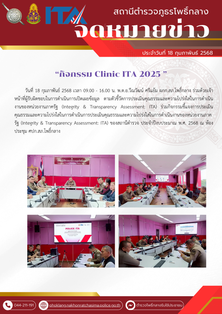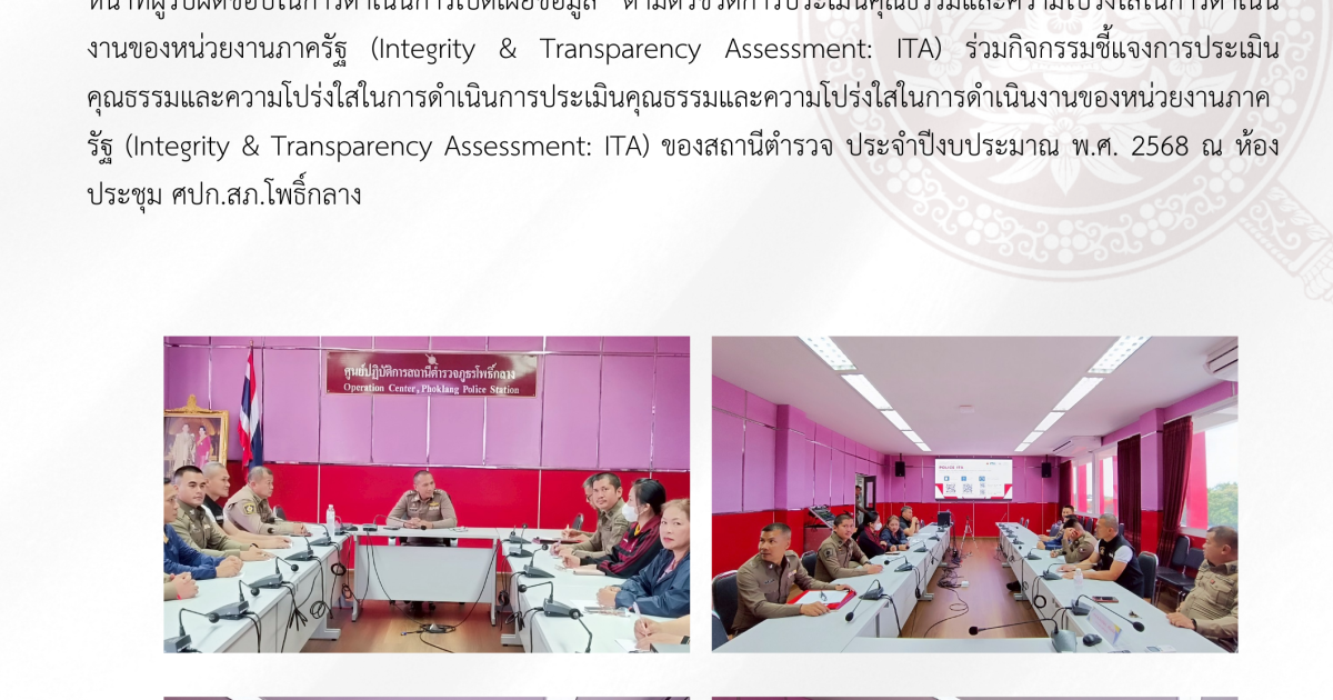 วันที่ 18 กุมภาพันธ์ 2568 เวลา 09.00 – 16.00 น. พ.ต.อ.วีณวัฒน์ ศรีแย้ม ผกก.สภ.โพธิ์กลาง พร้อมเจ้าหน้าที่ผู้รับผิดชอบในการดำเนินการเปิดเผยข้อมูล ตามตัวชี้วัดการประเมินคุณธรรมและความโปร่งใสในการดำเนินงานของหน่วยงานภาครัฐ (Integrity & Transparency Assessment: ITA) ประจำปีงบประมาณ พ.ศ.2568 ร่วมกิจกรรมชี้แจงการประเมินคุณธรรมและความโปร่งใสในการดำเนินการประเมินคุณธรรมและความโปร่งใสในการดำเนินงานของหน่วยงานภาครัฐ (Integrity & Transparency Assessment: ITA) ของสถานีตำรวจ ประจำปีงบประมาณ พ.ศ. 2568 ณ ห้องประชุม ศปก.สภ.โพธิ์กลาง