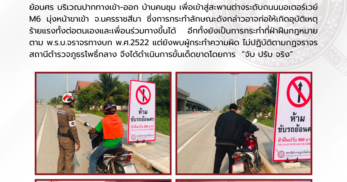 ตามที่ได้มีการติดตั้งป้ายและประชาสัมพันธ์แจ้งเตือนผู้ใช้รถใช้ถนน ห้ามขับรถ ย้อนศร บริเวณปากทางเข้า-ออก บ้านคนชุม เพื่อเข้าสู่สะพานต่างระดับถนนมอเตอร์เวย์ M6 มุ่งหน้าขาเข้า จ.นครราชสีมา ซึ่งการกระทำลักษณะดังกล่าวอาจก่อให้เกิดอุบัติเหตุร้ายแรงทั้งต่อตนเองและเพื่อนร่วมทางขึ้นได้ อีกทั้งยังเป็นการกระทำที่ฝ่าฝืนกฎหมาย ตาม พ.ร.บ.จราจรทางบก พ.ศ.2522 แต่ยังพบผู้กระทำความผิด ไม่ปฏิบัติตามกฏจราจร สถานีตำรวจภูธรโพธิ์กลาง จึงได้ดำเนินการขั้นเด็ดขาดโดยการ “จับ ปรับ จริง”