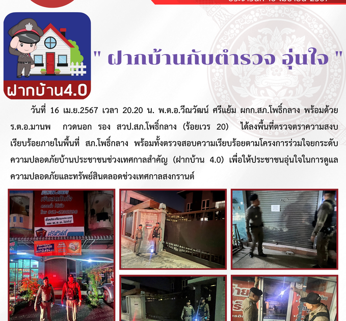 วันที่ 16 เม.ย.2567 เวลา 20.20 น. พ.ต.อ.วีณวัฒน์ ศรีแย้ม ผกก.สภ.โพธิ์กลาง พร้อมด้วย ร.ต.อ.มานพ กวดนอก รอง สวป.สภ.โพธิ์กลาง (ร้อยเวร 20) ได้ลงพื้นที่ตรวจตราความสงบเรียบร้อยภายในพื้นที่ สภ.โพธิ์กลาง พร้อมทั้งตรวจสอบความเรียบร้อยตามโครงการร่วมใจยกระดับความปลอดภัยบ้านประชาชนช่วงเทศกาลสำคัญ (ฝากบ้าน 4.0) เพื่อให้ประชาชนอุ่นใจในการดูแลความปลอดภัยและทรัพย์สินตลอดช่วงเทศกาลสงกรานต์