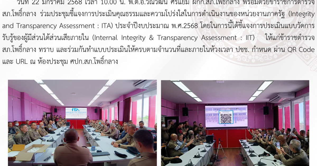 วันที่ 22 มกราคม 2568 เวลา 10.00 น. พ.ต.อ.วีณวัฒน์ ศรีแย้ม ผกก.สภ.โพธิ์กลาง พร้อมด้วยข้าราชการตำรวจ สภ.โพธิ์กลาง ร่วมประชุมชี้แจงการประเมินคุณธรรมและความโปร่งใสในการดำเนินงานของหน่วยงานภาครัฐ (Integrity and Transparency Assessment : ITA) ประจำปีงบประมาณ พ.ศ.2568 โดยในการนี้ได้ชี้แจงการประเมินแบบวัดการรับรู้ของผู้มีส่วนได้ส่วนเสียภายใน (Internal Integrity & Transparency Assessment : IIT) ให้แก่ข้าราชตำรวจ สภ.โพธิ์กลาง ทราบ และร่วมกันทำแบบประเมินให้ครบตามจำนวนที่และภายในห้วงเวลา ปชช. กำหนด ผ่าน QR Code และ URL ณ ห้องประชุม ศปก.สภ.โพธิ์กลาง