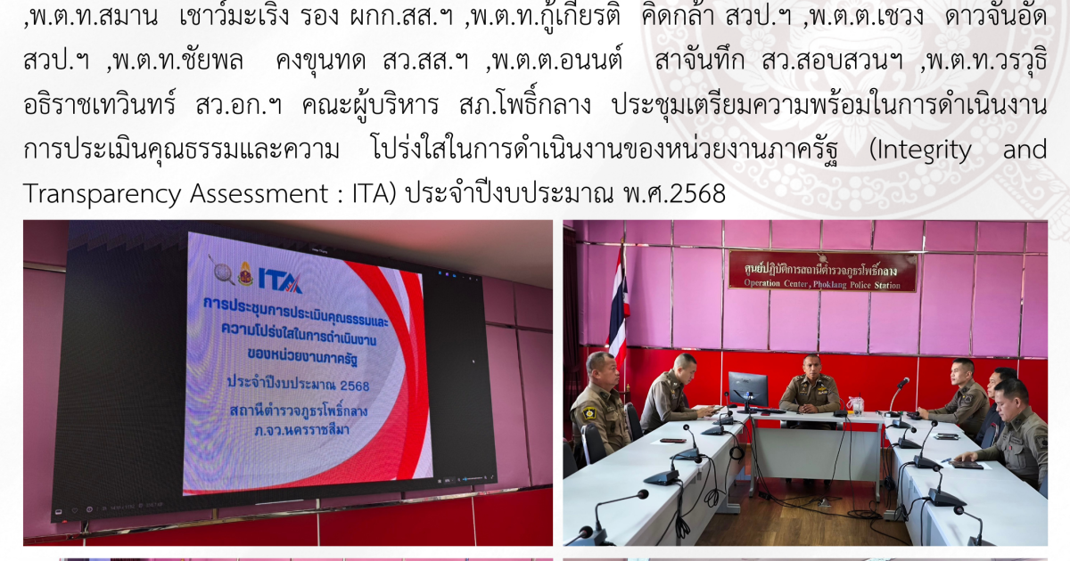 วันที่ 14 พฤศจิกายน 2567 เวลา 10.00 น. พ.ต.อ.วีณวัฒน์ ศรีแย้ม ผกก. พร้อมด้วย พ.ต.ท.ทัศนัย นคราวนากุล รอง ผกก.ป.ฯ ,พ.ต.ท.มรุต สันติเศรษฐสิน รอง ผกก.สอบสวนฯ ,พ.ต.ท.สมาน เชาว์มะเริง รอง ผกก.สส.ฯ ,พ.ต.ท.กู้เกียรติ คิดกล้า สวป.ฯ ,พ.ต.ต.เชวง ดาวจันอัด สวป.ฯ ,พ.ต.ท.ชัยพล คงขุนทด สว.สส.ฯ ,พ.ต.ต.อนนต์ สาจันทึก สว.สอบสวนฯ ,พ.ต.ท.วรวุธิ อธิราชเทวินทร์ สว.อก.ฯ คณะผู้บริหาร สภ.โพธิ์กลาง ประชุมเตรียมความพร้อมในการดำเนินงาน การประเมินคุณธรรมและความ โปร่งใสในการดำเนินงานของหน่วยงานภาครัฐ (Integrity and Transparency Assessment : ITA) ประจำปีงบประมาณ พ.ศ.2568