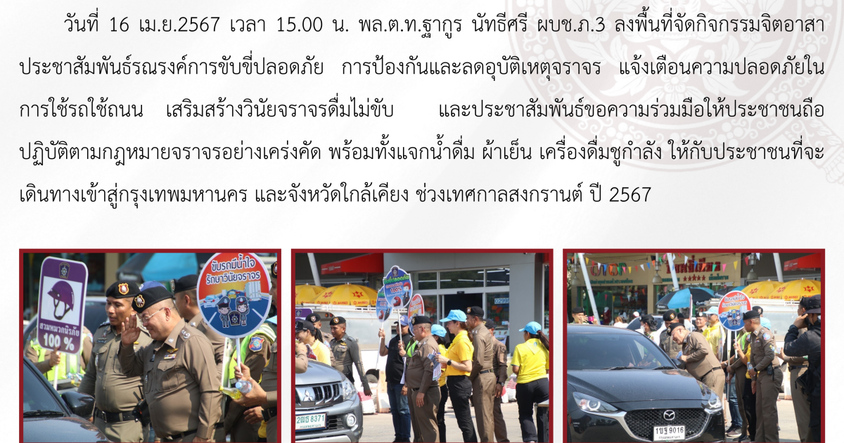วันที่ 16 เม.ย.2567 เวลา 15.00 น. พล.ต.ท.ฐากูร นัทธีศรี ผบช.ภ.3 ลงพื้นที่จัดกิจกรรมจิตอาสาประชาสัมพันธ์รณรงค์การขับขี่ปลอดภัย การป้องกันและลดอุบัติเหตุจราจร แจ้งเตือนความปลอดภัยในการใช้รถใช้ถนน เสริมสร้างวินัยจราจรดื่มไม่ขับ และประชาสัมพันธ์ขอความร่วมมือให้ประชาชนถือปฏิบัติตามกฎหมายจราจรอย่างเคร่งคัด พร้อมทั้งแจกน้ำดื่ม ผ้าเย็น เครื่องดื่มชูกำลัง ให้กับประชาชนที่จะเดินทางเข้าสู่กรุงเทพมหานคร และจังหวัดใกล้เคียง ช่วงเทศกาลสงกรานต์ ปี 2567