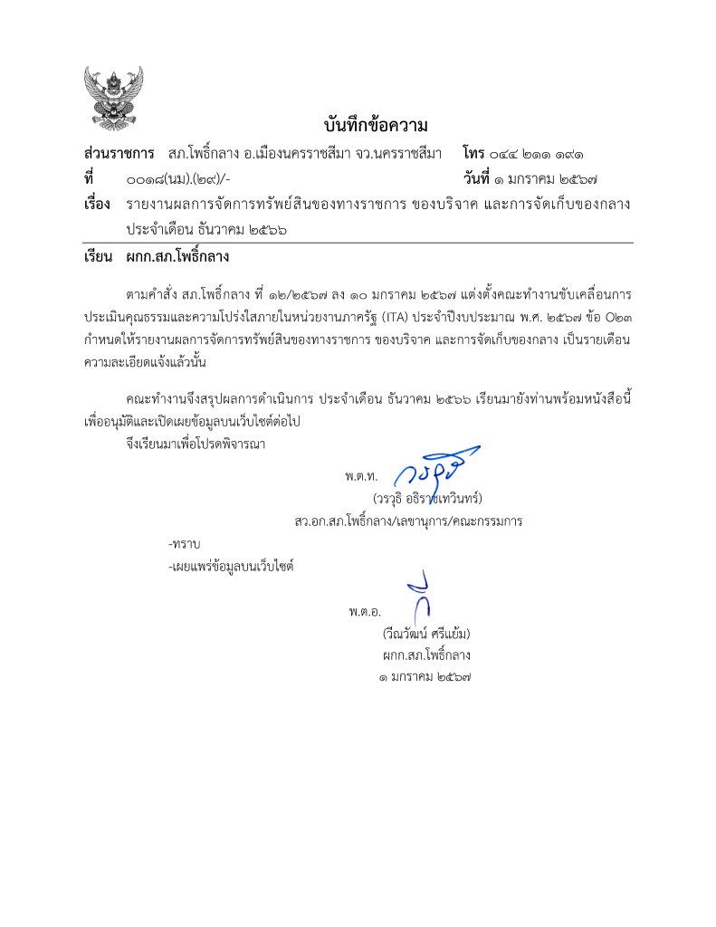 รายงานผลการปฏิบัติเกี่ยวกับการจัดการทรัพย์สินของราชการ ประจำเดือน ธันวาคม พ.ศ.2566