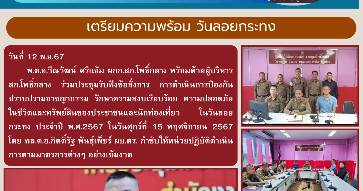 พ.ต.อ.วีณวัฒน์ ศรีแย้ม ผกก.สภ.โพธิ์กลาง พร้อมด้วยผู้บริหาร สภ.โพธิ์กลาง ร่วมประชุมรับฟังข้อสั่งการ การดำเนินการป้องกันปราบปรามอาชญากรรม รักษาความสงบเรียบร้อย ความปลอดภัยในชีวิตและทรัพย์สินของประชาชนและนักท่องเที่ยว ในวันลอยกระทง ประจำปี พ.ศ.2567 ในวันศุกร์ที่ 15 พฤศจิกายน 2567 โดย พล.ต.อ.กิตติ์รัฐ พันธุ์เพ็ชร์ ผบ.ตร. กำชับให้หน่วยปฏิบัติดำเนินการตามมาตรการต่างๆ อย่างเข้มงวด