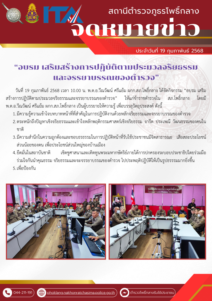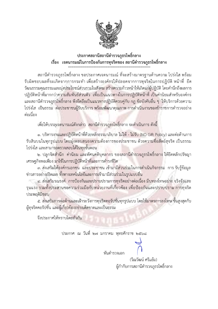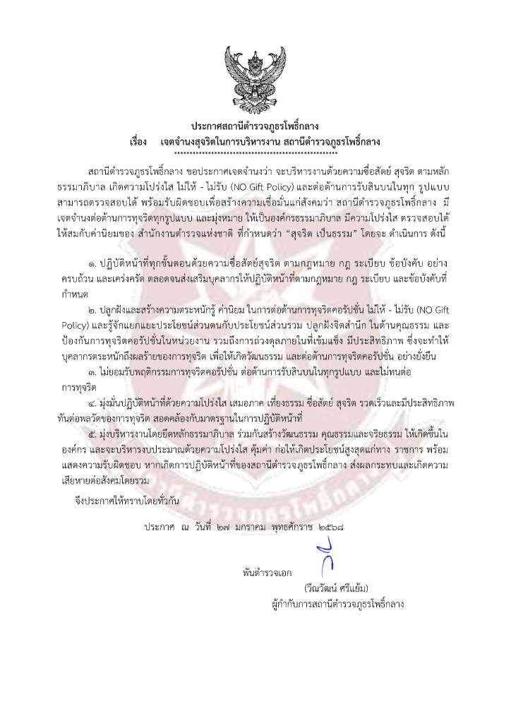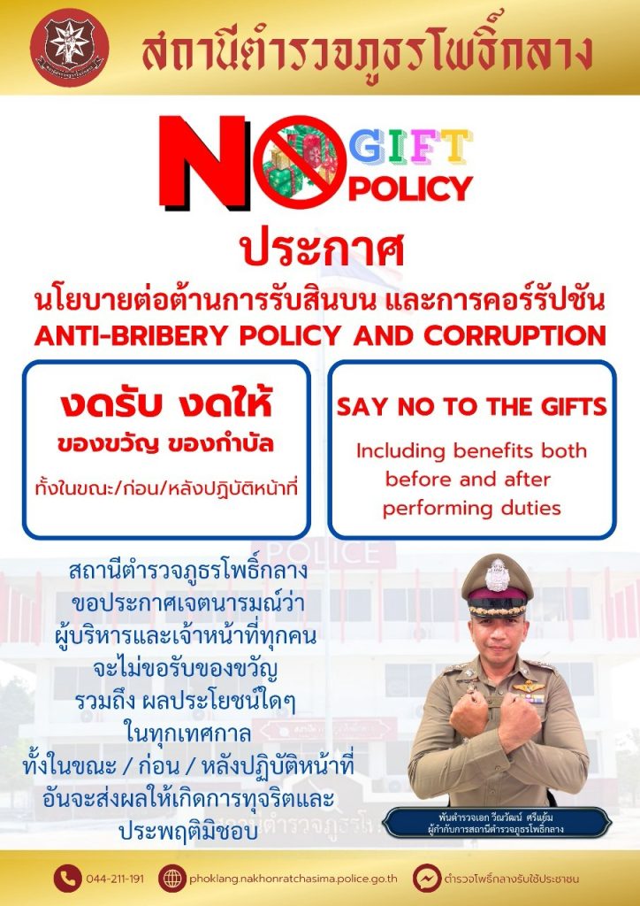พ.ต.อ.วีณวัฒน์ ศรีแย้ม ผกก.สภ.โพธิ์กลาง จัดกิจกรรมที่แสดงถึงนำนโยบายการต่อต้านการรับสินบน (Anti – Bribery Policy) ไปปฏิบัติดังนี้
